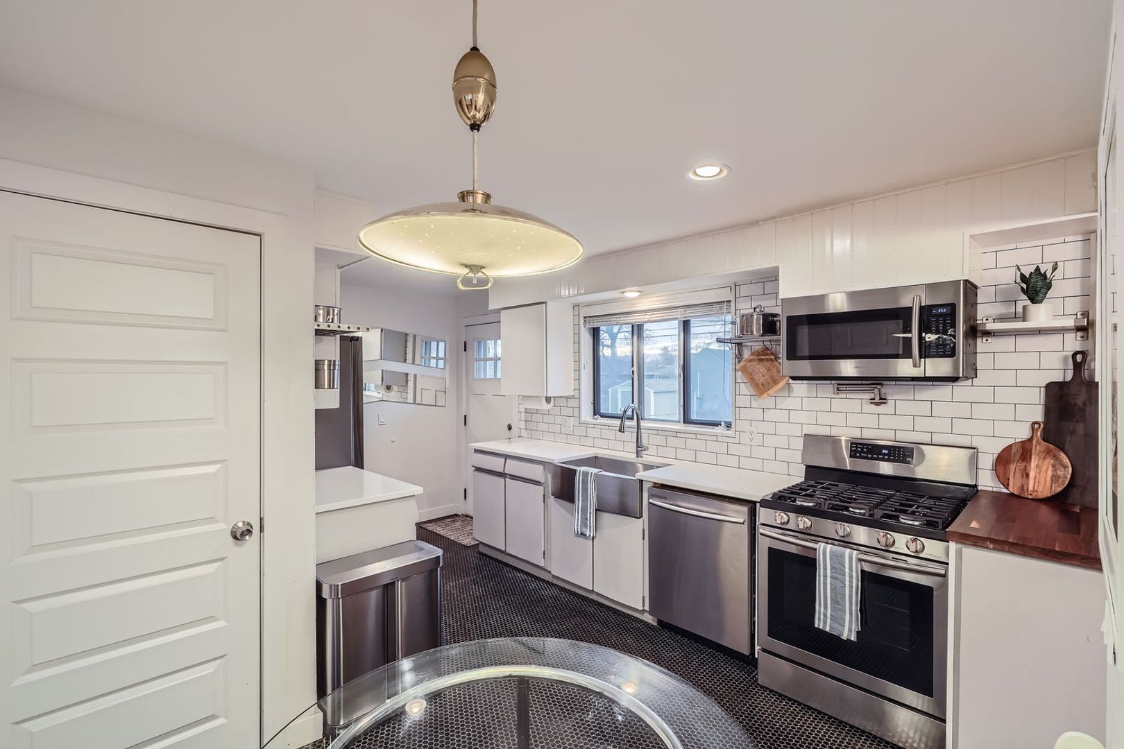 A sleek, modern kitchen with stainless steel appliances, including a gas range, microwave, dishwasher, refrigerator, and a convenient pot-filler.