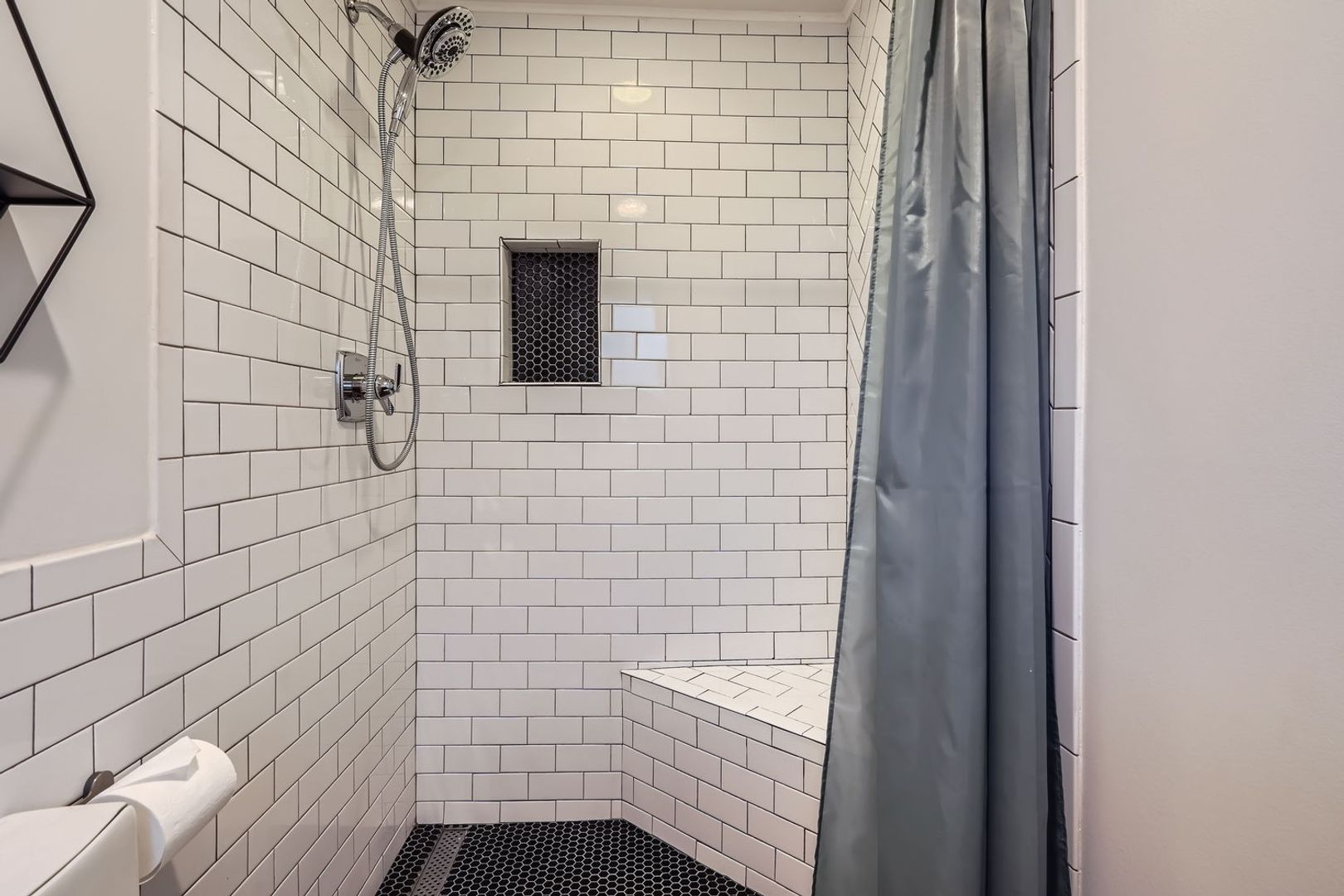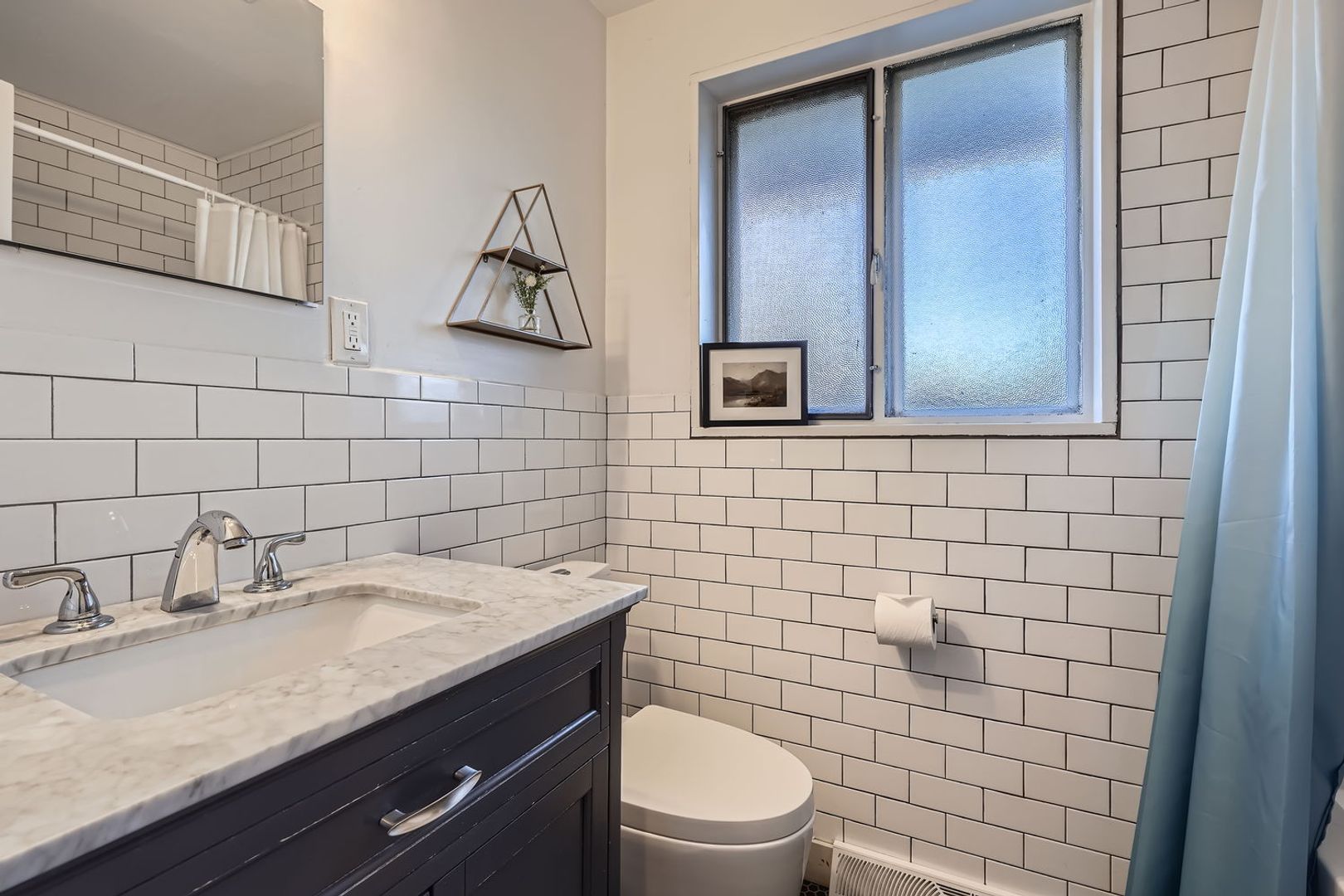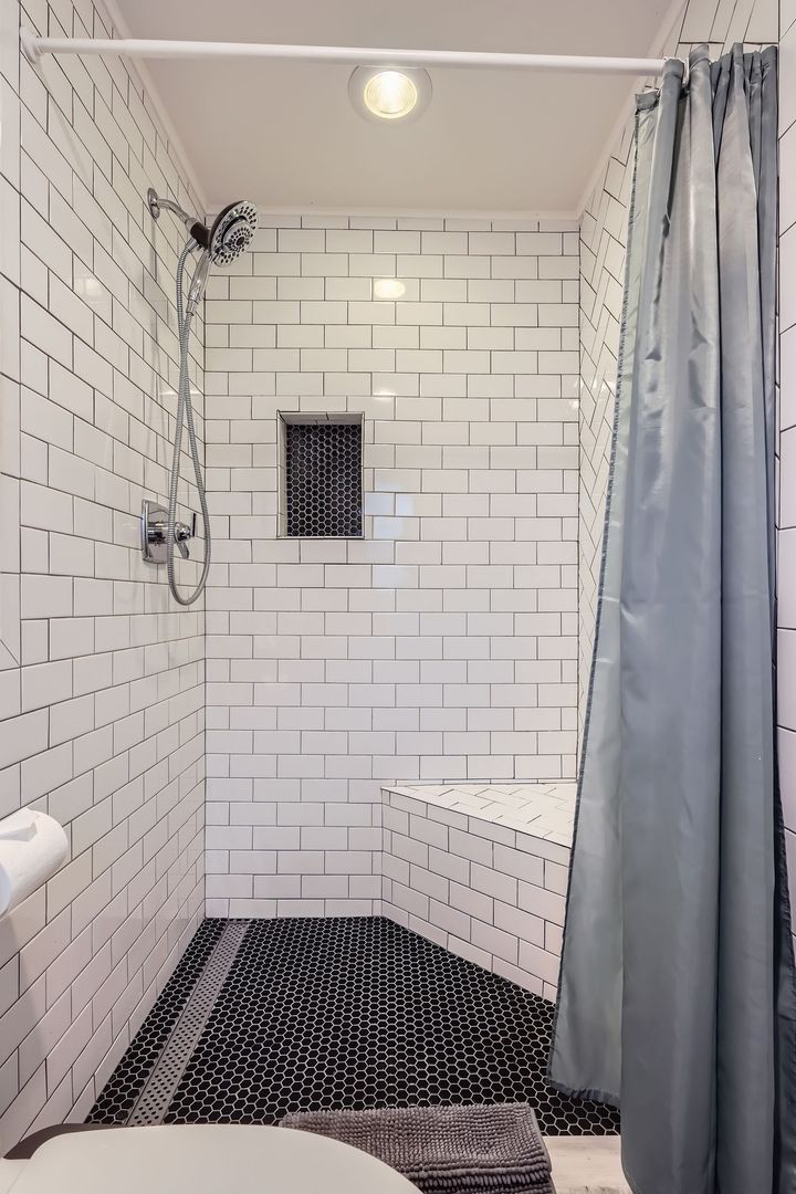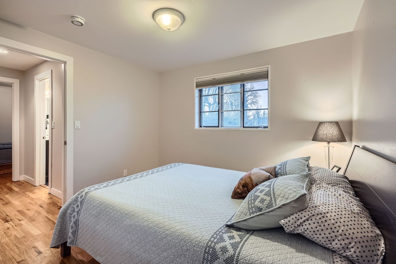 A large primary suite with a private, updated bathroom.