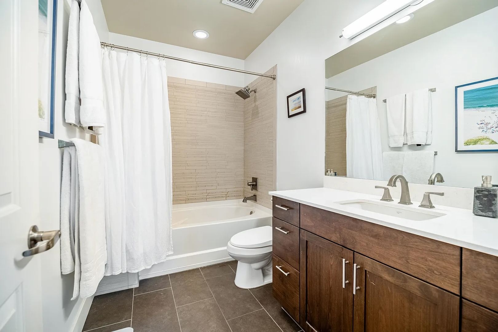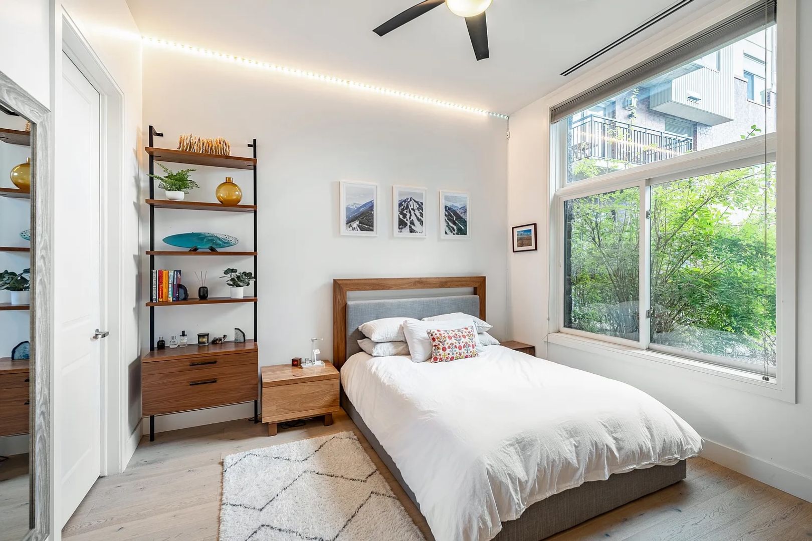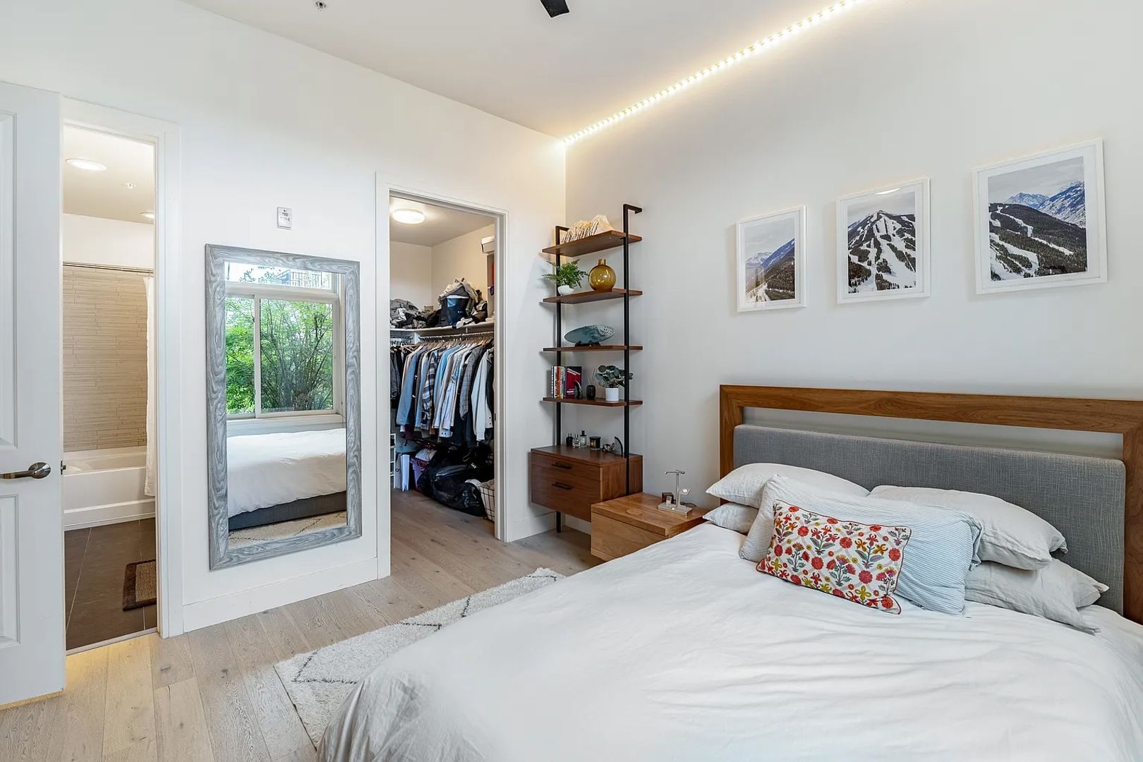 Spacious bedroom with privacy trees outside the window, a large walk-in closet, and a updated bathroom with a ergonomic bathtub and shower.