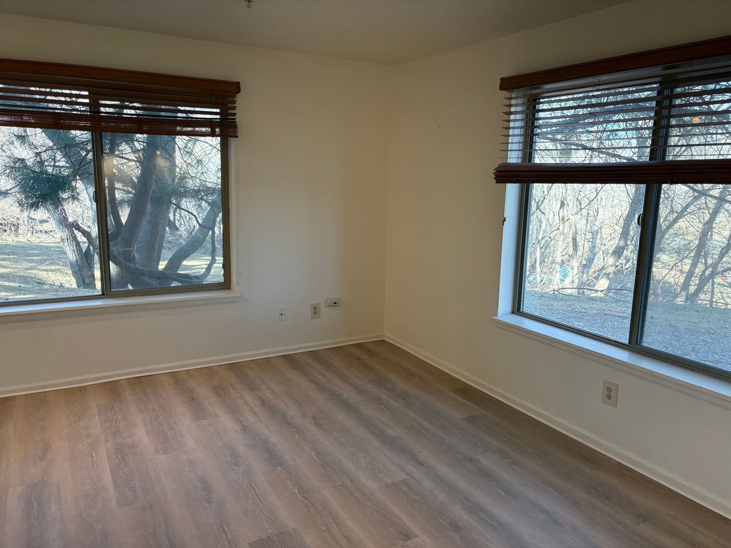 Large windows fill the apartment with natural light and overlook a lush green lawn, creating a peaceful setting—you may even spot local wildlife passing by.