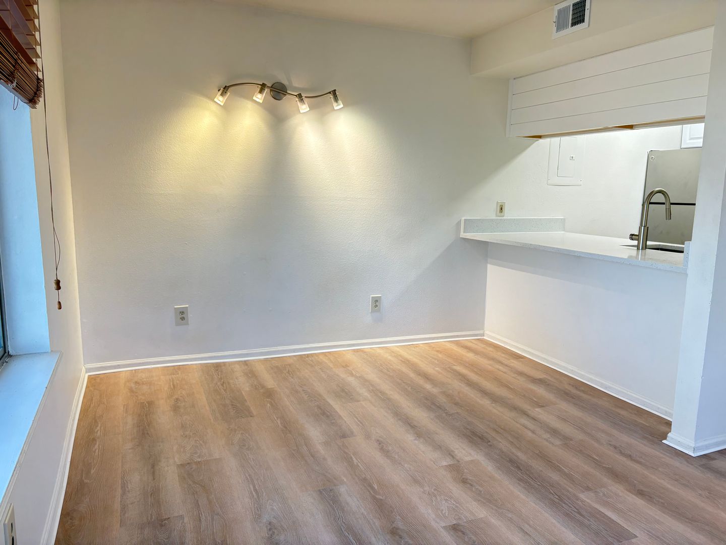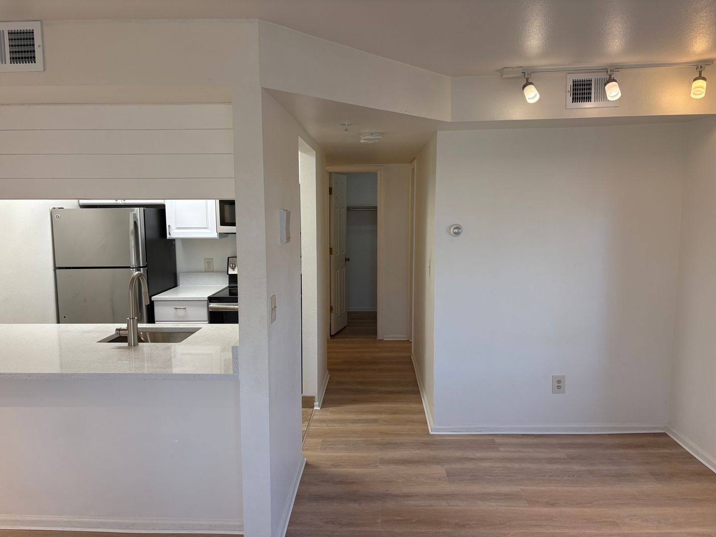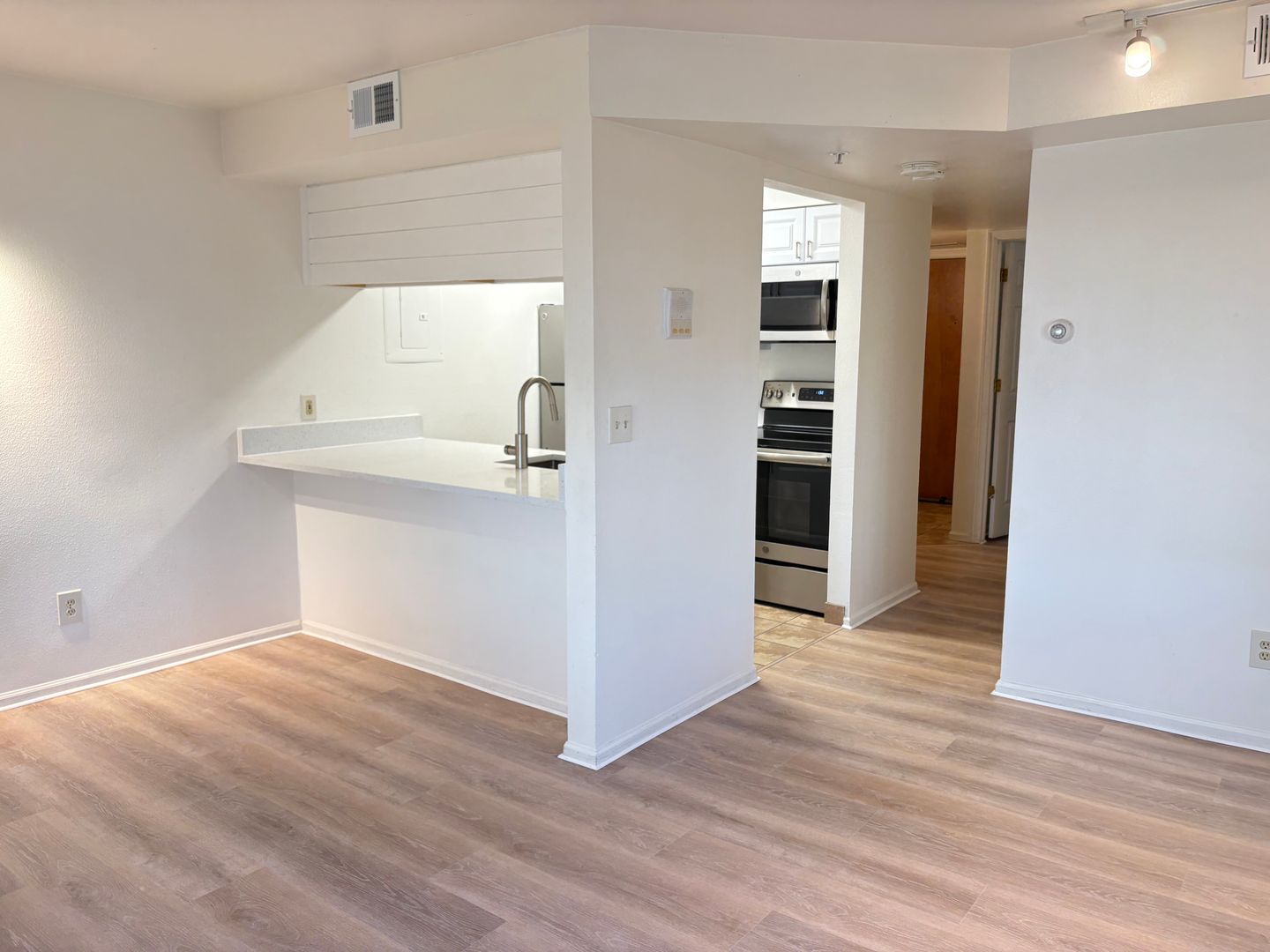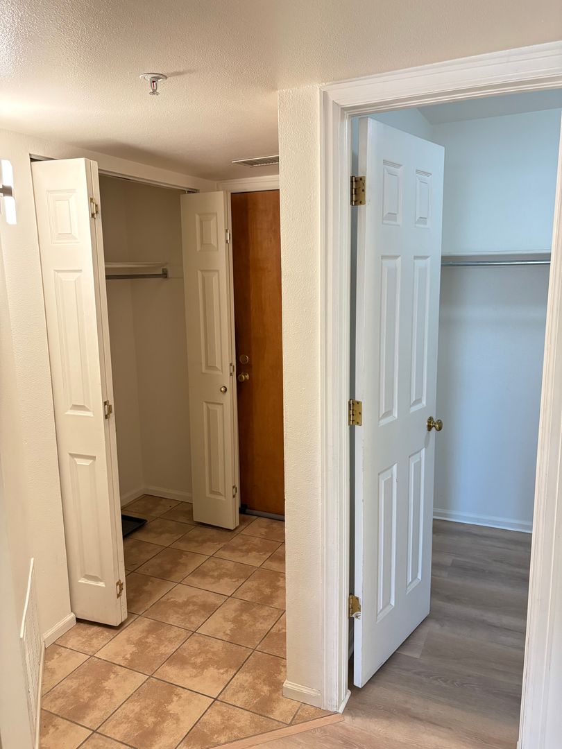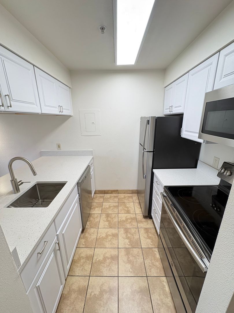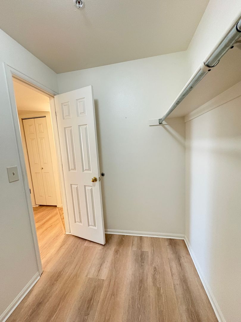 Inside, you’ll find modern upgrades throughout, including new luxury vinyl plank flooring, a stylish galley kitchen with stainless steel appliances, brand-new cabinetry, and a quartz countertop with bar seating. The refreshed bathroom features an updated tub/shower, while a generously sized walk-in closet—large enough to function as a home office—adds exceptional versatility. A detached, climate-controlled storage unit offers additional space for outdoor gear or seasonal items.