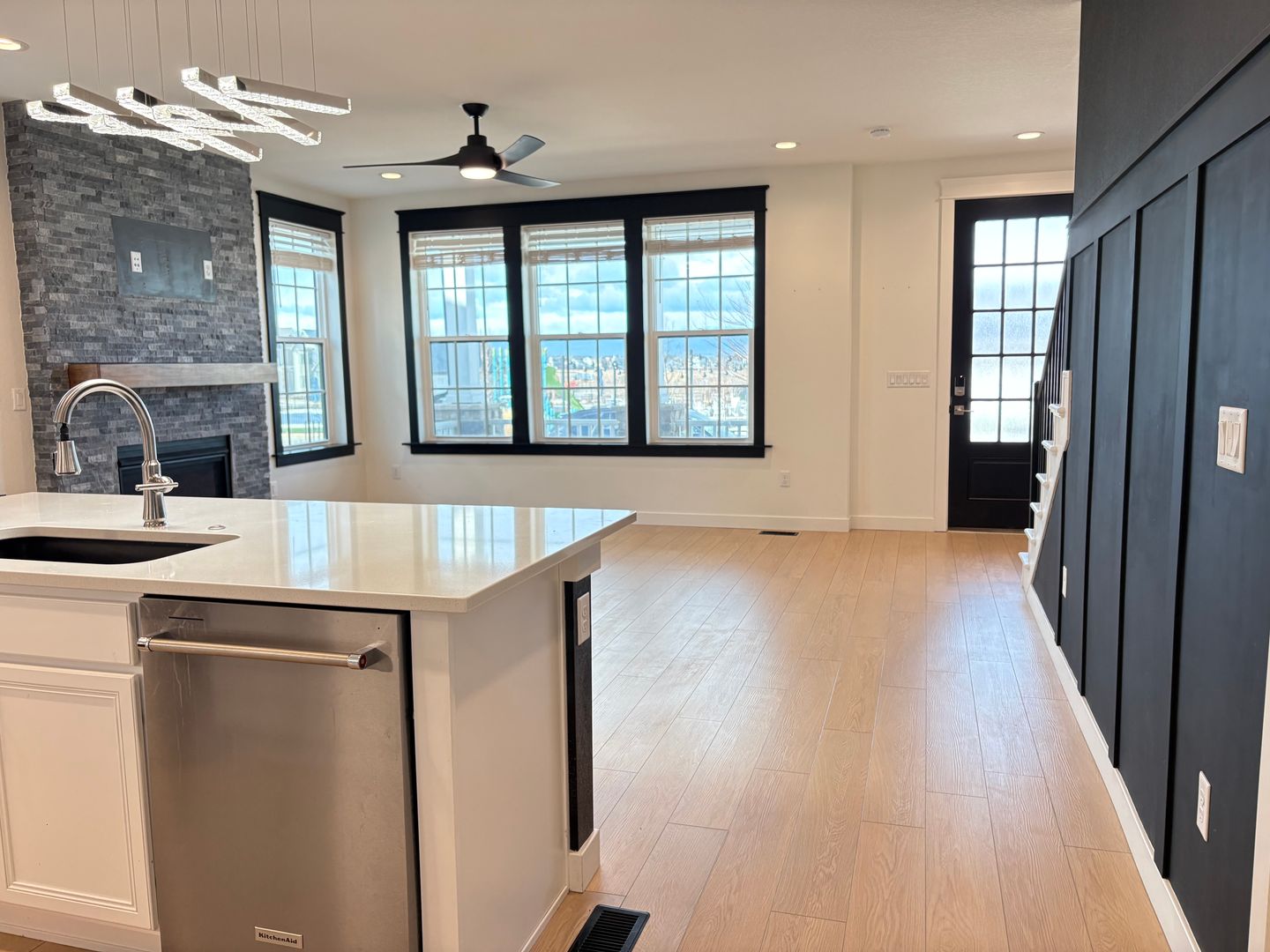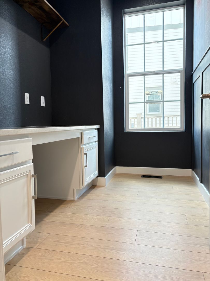 Home: West facing with mountain views, vaulted ceilings and abundant natural light throughout. Covered front porch, two car attached garage, fenced side yard. Home has an open-kitchen concept overlooking the living room with custom tile gas fireplace. Kitchen has high-end appliances, a large center island with breakfast bar, pantry, and plenty of cabinet/counter space. Home office with built in desk, half bathroom, and access to the garage on main level.