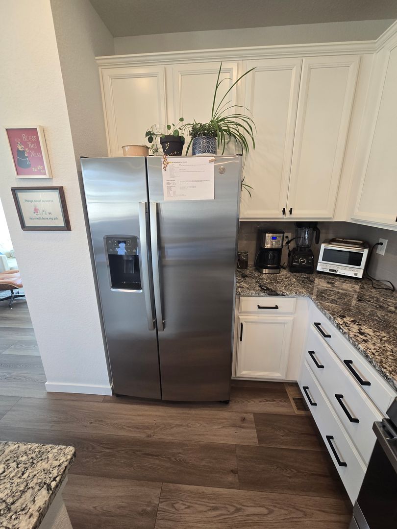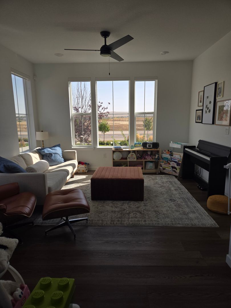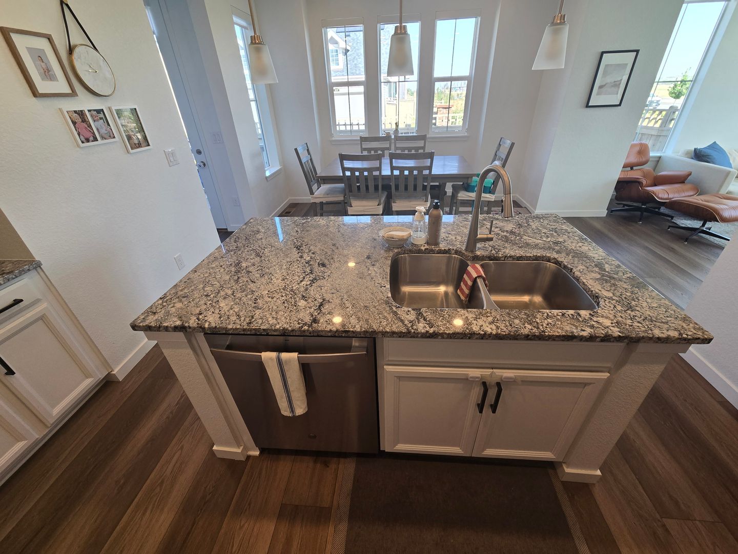 Main level has wood laminate flooring. Living and dining room are very large and sunny with many windows. Large island in kitchen with stainless steel appliances. Big pantry included, great for food storage. 2 car attached garage included. Guest bedroom with full bath on main floor.