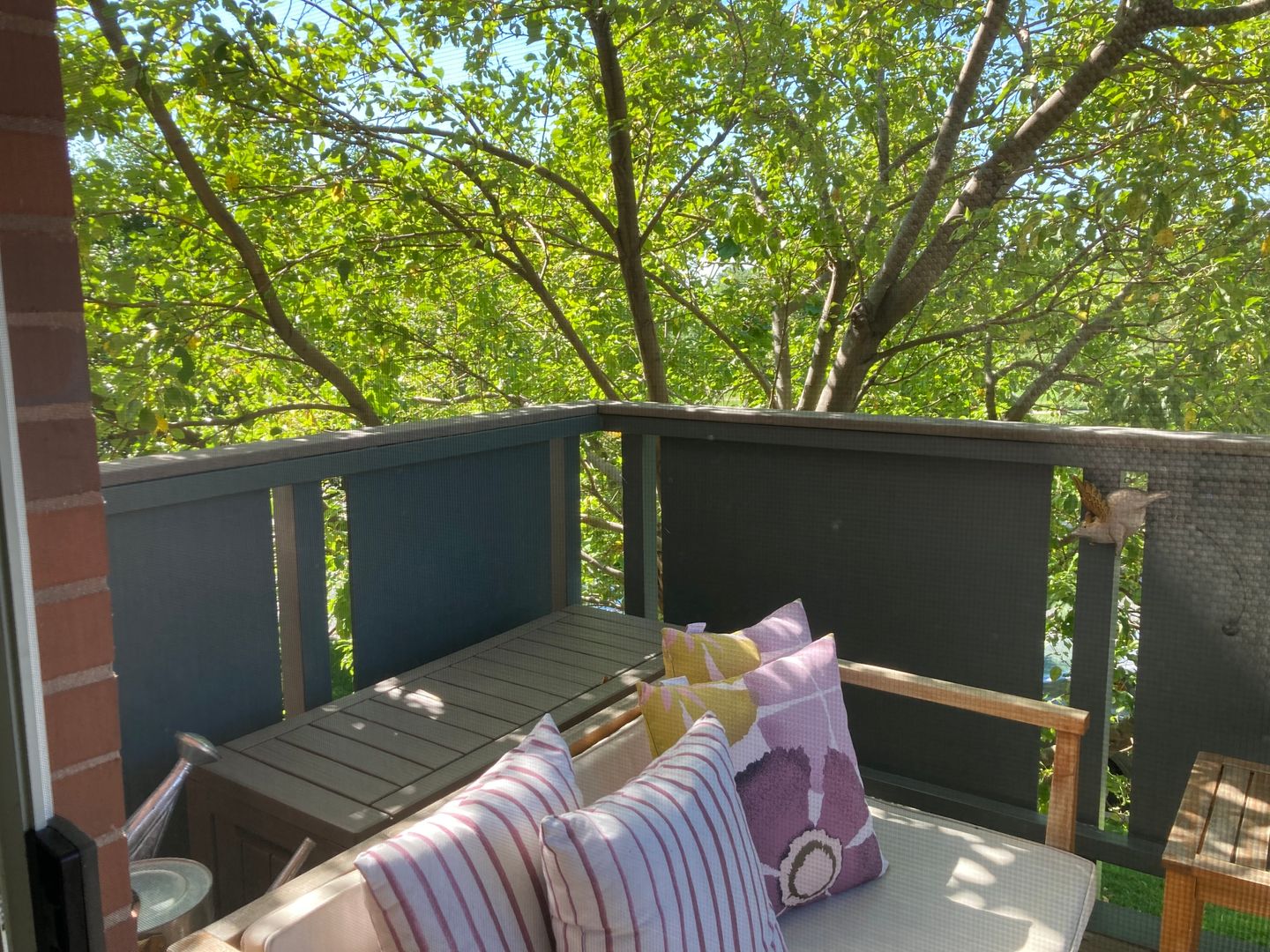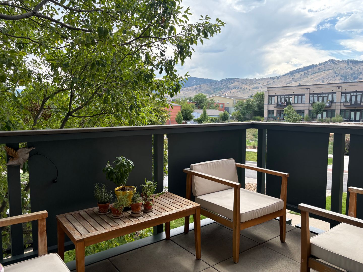 Walk into this corner unit condo and you are greeted with beautiful hardwood floors, an open floor plan, and South West facing windows offering abundant natural light and panoramic mountain views. Covered deck offers privacy with mature trees & drop down sunshades. Enjoy your morning coffee while taking in views of the Paragliders over the Foothills. Living room with gas fireplace. Updated kitchen with stainless steel appliances. Both bedrooms and two full bathrooms down the hall off the living room.