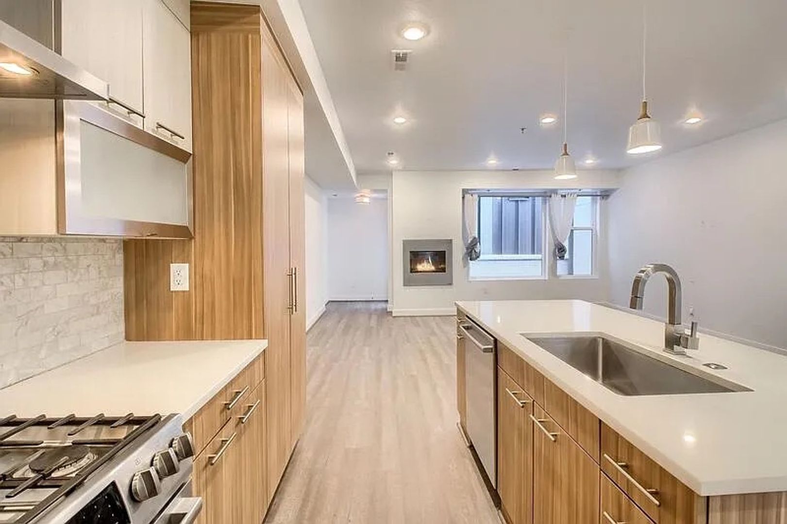 The main level features hardwood floors, high ceilings, and a seamless flow between the living, dining, and kitchen areas. The kitchen is a true centerpiece with quartz countertops, stainless steel appliances, and a large island, perfect for entertaining. A cozy fireplace anchors the living space, while a main-floor office or non-conforming third bedroom with an attached bath adds flexibility.