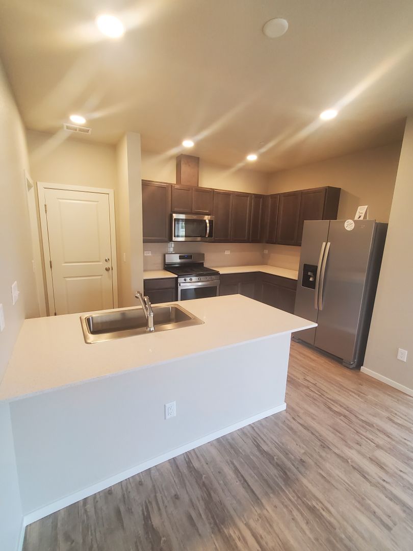A corner unit townhome featuring an open concept main-floor with eat-in kitchen island, walk-in pantry, and half bath. The second floor consists of 3 bedrooms with walk-in closets and two full bathrooms as well as a dedicated laundry room.This unit will feature Stainless Steel appliances, Macchiato Grey Painted cabinets, White quartz countertops, Almond Oak Luxury vinyl plank flooring on main level, Upgraded Carpet, Double master vanity with drawer bank, 3x6 Subway tile Kitchen backsplash, Garage door opener, Central A/C.